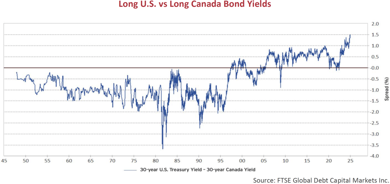 Canso was founded in 1997. Prior to this time, the U.S. long bond yield had always been lower than in Canada. But for the past 28 years, the inverse has largely been true. Might this be due to Canada having a higher credit quality? A more robust economy? A firmer control on inflation? Our response to these points would be, “Unlikely”. In our view, this Canadian premium (or discount depending on how you view it) is not based on fundamentals. If the Canadian economy experiences further weakness, we believe there is underappreciated risk to long Canada yields, especially relative to U.S. levels.