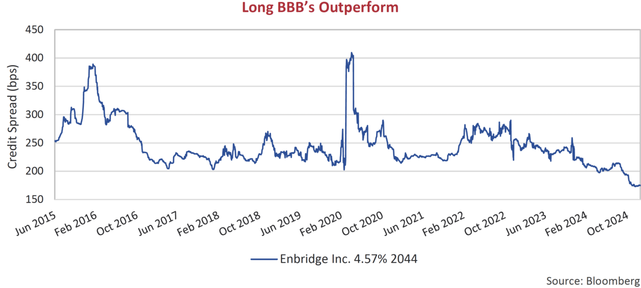Investors increasingly added credit risk in pursuit of the additional yield on offer in lower quality BBB-rated opportunities. Canadian grocer Metro Inc. highlighted the sentiment when it issued a 5-year senior unsecured bond in November at a credit spread of 81 bps, the tightest 5-year BBB spread on record. The paltry risk premium didn’t scare off investors as the order book was more than 4x oversubscribed.