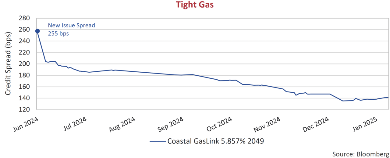 The largest corporate bond deal in Canadian history produced one of the most intriguing charts of 2024. Coastal Gas Link, which issued $7.15 billion of debt in June last year, experienced spectacular credit spread tightening post-issuance. Investor demand outstripped the record supply, sending credit spreads tighter and bond prices higher. The Coastal Gas Link 5.857% secured bond due 2049, the longest issue of the 11-tranche deal, tightened from 255 bps at new issue to 140 bps today. This translates to a 16% relative price gain in 7 months, extraordinary for an A- rated secured issue in relatively behaved markets.