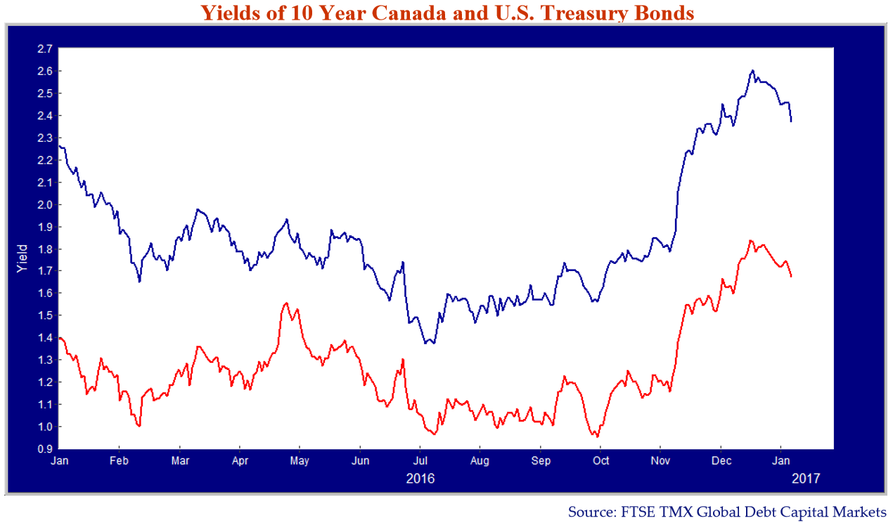 The 10 Year U.S. Treasury post Brexit panic yield of 1.37% on July 7th was lower than its 1.41% yield in July 2012 during the depths of the Euro Debt Crisis. The 10 Year Canada bond actually broke 1% in July with a low yield of .95%, which could be our generational low. Bond yields then began to rise in the U.S. and moved sharply higher after the election of Donald Trump. Part of this was fears of Trump’s expansionary fiscal platform and the Republican tax cutting agenda that both threaten much higher deficits and robust U.S. Treasury bond issuance. It also reflected the end of the flight to bond safety trade. Why hide out in bonds when you can make money in the stock market?