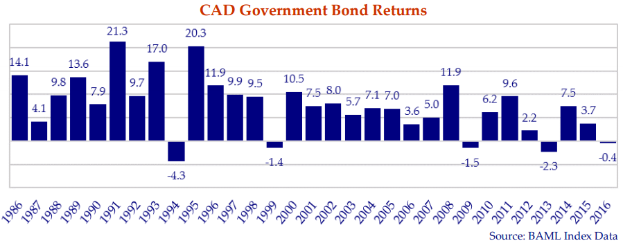 The game has not proved so easy of late. Over the last 8 years, Canadian government bonds generated negative annual returns 3 times. It is not out of the question 2017 could produce the heretofore unthinkable – two consecutive years of negative government bond market returns!