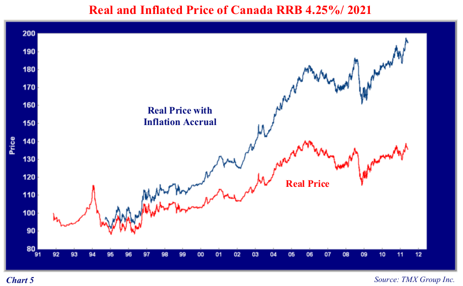 The current real price of $135 for the 2021 RRB gives a real yield to maturity of 0.8% based on the 10 years remaining until the Canadian government repays the bond in December 2021. The structure of the RRB is elegant in its simplicity. It takes normal bond mathematics and uses them to establish the “real price” and “real yield”. The real price of this bond since 1991 can be seen in Chart 5. As with any bond, its price has risen as market yields have dropped. The bond is now at a substantial premium reflecting its very high coupon of 4.25% compared to a current new issue RRB at the 1% real yield level.
