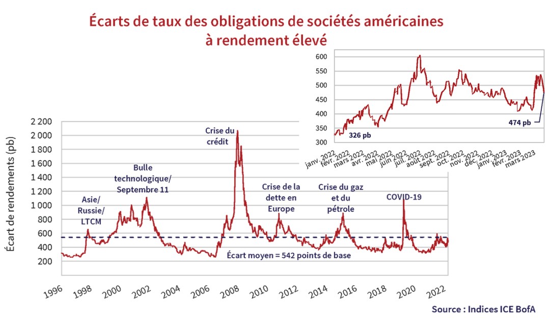 Le marché américain des obligations à rendement élevé et des prêts a commencé à enregistrer une hausse des défauts de paiement au premier trimestre de 2023. Au cours du trimestre, JP Morgan a dénombré 12 sociétés en défaut de paiement totalisant 18,4 milliards de dollars américains répartis entre obligations et prêts, et 5 autres sociétés ont réalisé un échange de titres en difficulté touchant quelques 2,2 milliards de dollars américains. Le total combiné représente déjà 43 % du total de l’exercice précédent et a dépassé le creux de 14 ans enregistré en 2021.