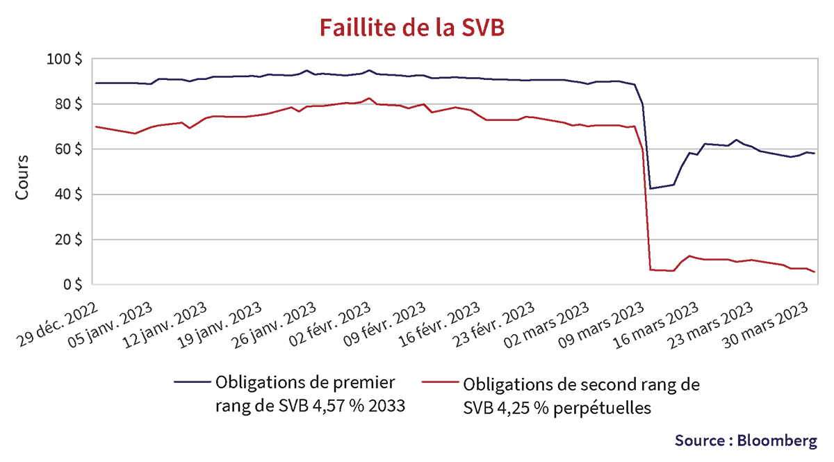 Premièrement, les quatre parties déterminèrent qu’il s’agissait d’un « risque systémique », ce qui ouvra les vannes du pouvoir. La désignation de « risque systémique » permettait à la FDIC de protéger pleinement tous les déposants, assurés ou non. Pour ne pas être considérée comme un « sauvetage par les contribuables », toute perte subie par le fonds d’assurance-dépôts allait être compensée par une cotisation spéciale imposée aux autres banques. De plus, le sauvetage ne protégeait ni les créanciers, ni les actionnaires, ni la direction. Comme illustré dans le graphique des obligations non garanties de premier rang et subordonnées de second rang de SVB ci-dessous, l’adoption rapide des mesures visant à protéger les déposants se traduira probablement par un recouvrement incomplet des créances de premier rang et quasi inexistant des créances de second rang.