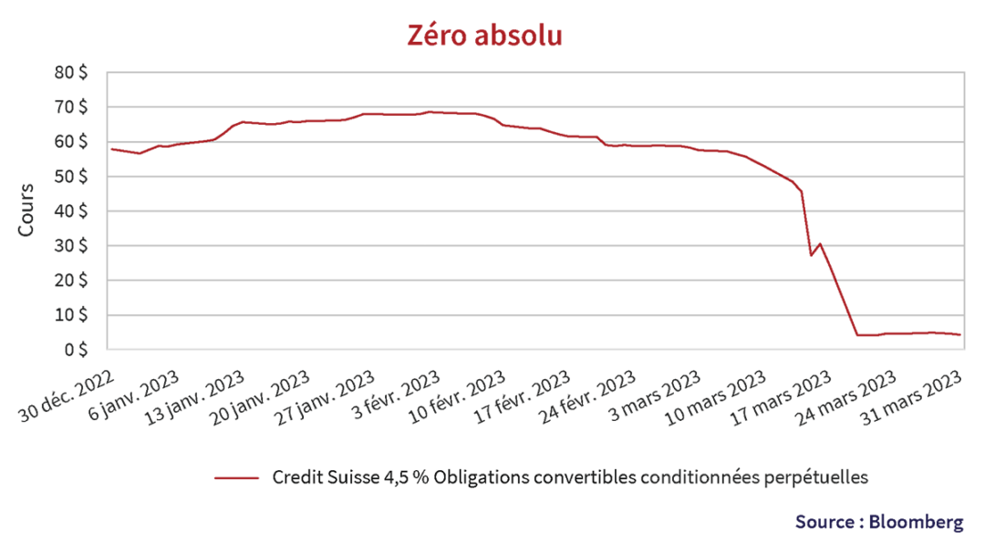 Pour la plupart des titres AT1 mondiaux, y compris les BCRL (LRCNs) canadiens, un scénario de crise au sein de la banque signifierait que les actions ordinaires et les titres AT1 soient fortement dépréciés. Il est rare de voir des titres de rang supérieur dans la structure du capital (AT1) être entièrement amortis sans que les titres de rang inférieur (actions ordinaires) ne soient également entièrement amortis. Mais en Suisse, les documents de placement indiquent clairement que ce scénario est possible.