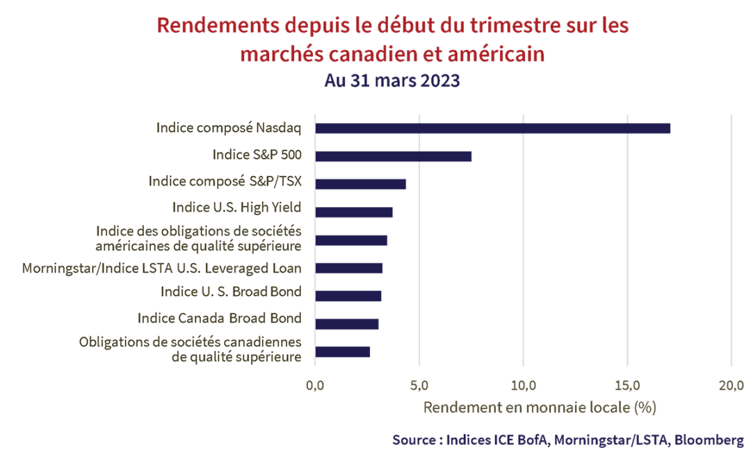 Le premier trimestre s’est avéré turbulent, surtout pour les investisseurs obligataires, confrontés à de fortes variations des rendements. Une fois la situation normalisée, la montée de l’appétence pour le risque et la baisse des rendements obligataires ont fini par calmer la volatilité du marché. Le graphique ci-dessous illustre les rendements trimestriels des principaux indices de titres à revenu fixe et d’actions. Les marchés boursiers se sont sortis indemnes de l’incertitude générée par le secteur bancaire et ont enregistré de robustes gains au cours du trimestre. La reprise des titres technologiques a également permis au Nasdaq de dégager un rendement nettement supérieur. La baisse des rendements des obligations d’État et la résilience des écarts de taux, exception faite de ceux des émetteurs bancaires, ont soutenu les marchés des titres à revenu fixe.