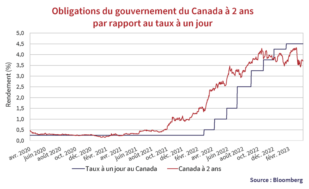 Les marchés obligataires de grande qualité au Canada et aux États-Unis ont tous deux progressé au cours du trimestre. L’incidence des rendements des obligations d’État continue d’être le principal facteur de rendement, alors que les investisseurs rajustent leurs attentes à l’égard des banques centrales. Les graphiques ci-dessous illustrent le rendement à deux ans des obligations du gouvernement canadien et du Trésor américain, où certaines des fluctuations les plus fortes ont été ressenties, par rapport au taux à un jour. Dans les deux cas, les rendements sont maintenant inférieurs au taux contrôlé par la banque centrale. Cela laisse penser que les investisseurs prévoient des baisses de taux dans un avenir proche.