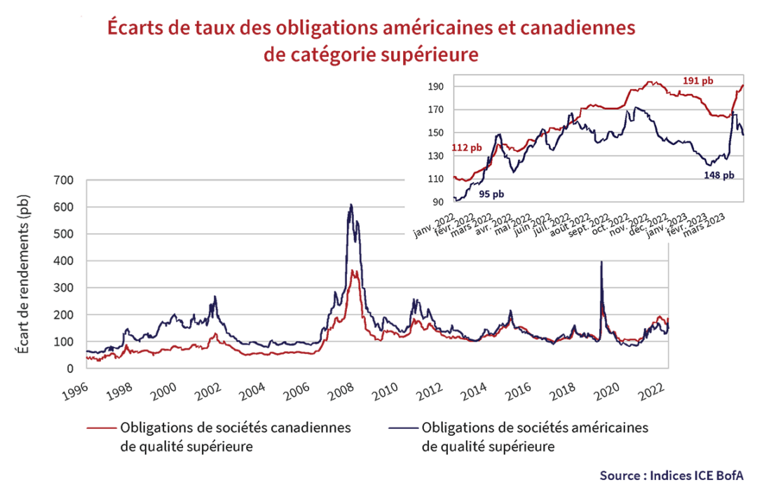 Après la forte hausse du mois de mars, les deux marchés ont terminé juste au-dessus de leur niveau du début du trimestre. Au Canada et aux États-Unis, les expositions aux émetteurs bancaires étaient responsables d’environ la moitié de l’écart supplémentaire en mars. Les écarts des émetteurs bancaires se sont accrus en moyenne de 55 points de base aux États-Unis et de 38 points de base au Canada. Toutefois, l’exposition de l’indice des obligations de sociétés canadiennes au secteur bancaire est beaucoup plus élevée, soit 32,5 %, comparativement à 18,2 % aux États-Unis.
