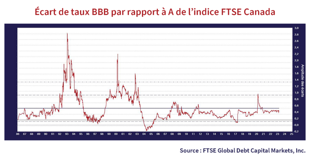 À la fin de 2022, nous avons constaté que les primes de risque pour les obligations de catégorie investissement étaient de plus en plus attrayantes. Cela était particulièrement vrai sur le marché canadien, où les écarts de taux divergeaient de ceux des États-Unis l’été dernier et semblent maintenant raisonnables à 191 points de base. Les écarts devenaient attrayants par rapport aux creux d’après la pandémie, mais aussi par rapport aux précédents historiques. D’après le graphique des antécédents historiques ci-dessus, nous pouvons observer que les écarts des titres canadiens de qualité supérieure se situent au-dessus des écarts importants de 2011 et de 2016 et ne sont inférieurs qu’à ceux de 2008 et de 2020.