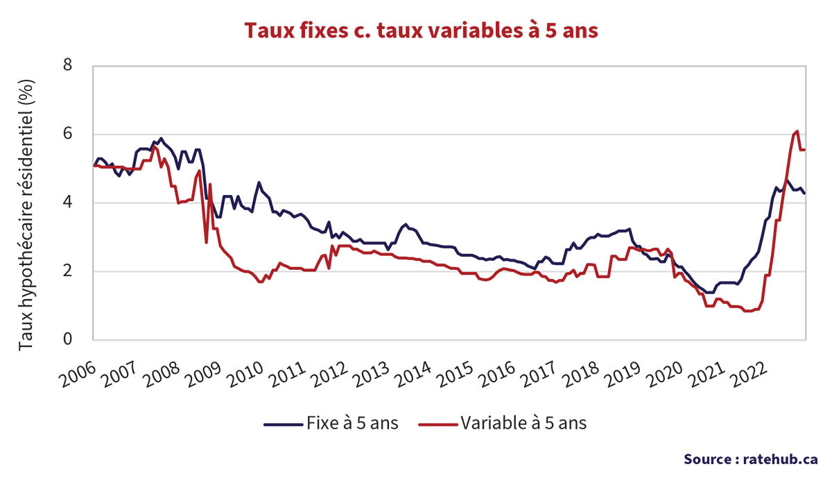 Ce plan de match est en voie d’être raturé, car le BSIF, l’organisme canadien de réglementation des banques, envisage maintenant d’informer les banques que ce plan est peu reluisant sur le plan des risques financiers. Qui l’eût cru? Quoi qu’il en soit, les emprunteurs s’exposent à la possibilité de 16 L’Observateur des marchés de Canso paiements sensiblement plus élevés lorsqu’ils devront à nouveau respecter l’amortissement initial. Nous calculons qu’un emprunteur qui avait choisi le taux variable de 0,85 % disponible en 2022 verra ses paiements augmenter de 90 % au moment de son renouvellement en 2027, en supposant que les taux variables actuels perdurent.