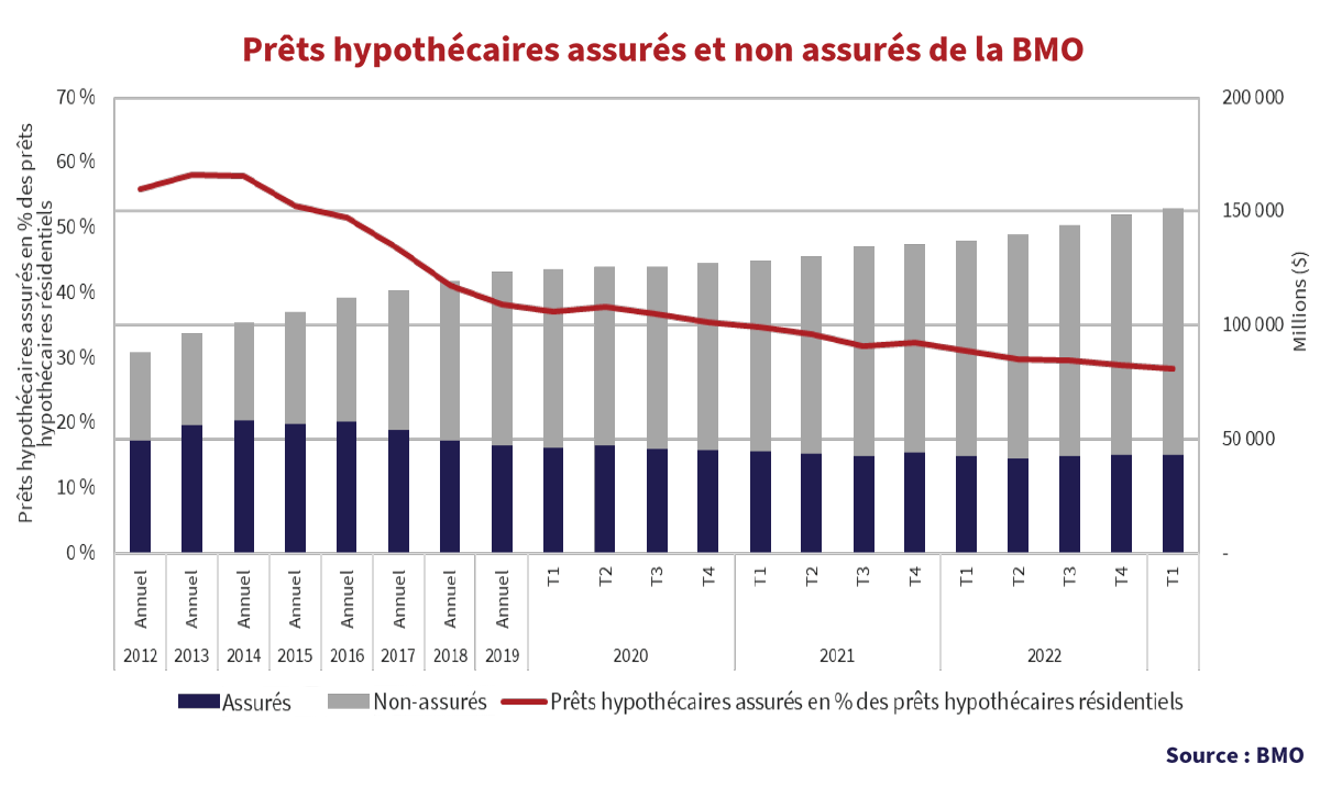 En fait, la situation est pire qu’en 2013 en termes d’exposition des banques canadiennes. Lorsque nous avons rédigé notre Rapport sur la situation, les banques étaient beaucoup plus protégées des difficultés liées à l’immobilier, car environ 60 % de leur exposition hypothécaire était assurée contre les pertes par le gouvernement. La SCHL a limité la quantité d’assurance à la disposition des grandes banques, et ce chiffre se rapproche maintenant de 30 %. Le tableau ci-dessous illustre le portefeuille de prêts hypothécaires de la BMO. En 2013, le portefeuille se chiffrait à 96 milliards de dollars, dont 56 milliards de dollars, ou 58 %, en prêts hypothécaires assurés. Les prêts hypothécaires assurés de la BMO ont baissé à 43 milliards de dollars en 2022, soit seulement 29 % de son portefeuille de prêts hypothécaires qui se chiffre aujourd’hui à 106 milliards de dollars.