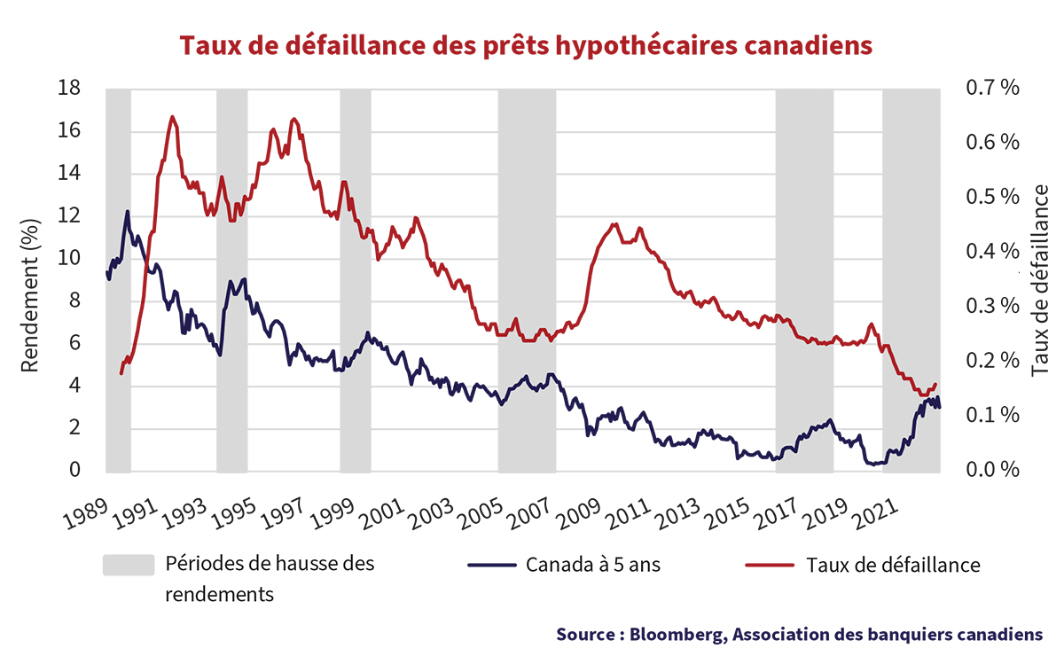 L’éventuel recul tant claironné du secteur immobilier canadien semble maintenant se concrétiser. Les arriérés hypothécaires augmentent de nouveau, à l’instar des taux d’intérêt, et les emprunteurs sont aux prises avec une dette hypothécaire très élevée, reflet du prix très élevé des maisons. La dernière fois que nous avons connu une longue période de baisse du prix des maisons, c’était au début des années 1990, et les arriérés hypothécaires et les pertes sur prêts ont alors monté en flèche. L’assureur hypothécaire privé MICC a fait faillite et la SCHL, garantie par le gouvernement, a eu besoin de l’aide du fédéral. Étant donné l’exposition accrue des banques canadiennes aux prêts hypothécaires résidentiels non assurés, leurs pertes sur prêts résidentiels pourraient augmenter et leurs profits en souffriront.