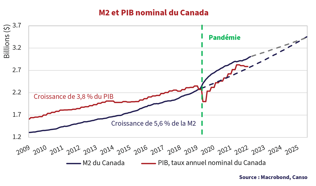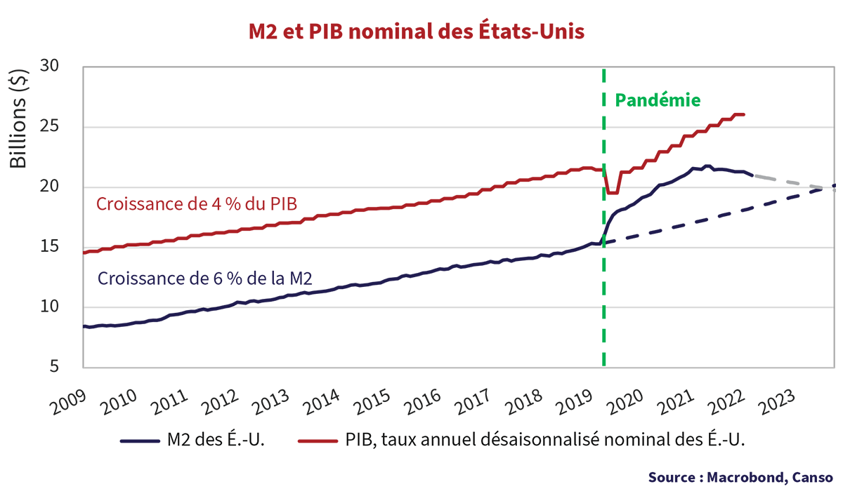 Nous pourrions interroger les esprits, les devins, ou une planche Ouija pour essayer de deviner l’avenir de la politique monétaire, mais nous préférons nettement nous fier à nos recherches. Le graphique cidessus illustre de façon très explicite ce qui est arrivé à la masse monétaire américaine pendant et après la pandémie. Ce graphique illustre le taux de croissance annualisé de la M2 américaine du 31 décembre 2009 à 2019, lequel s’est chiffré à 6 %. Ce taux a entraîné une croissance de 4 % du PIB nominal. Le bond après la pandémie qui a commencé au début de 2020 est clair. La M2 est passée de 15,4 billions de dollars juste avant la pandémie en février 2020 à un pic de 21,9 billions de dollars en mars 2022, soit une augmentation de 42 %. La bonne nouvelle, c’est que ces mesures de relance monétaire et les mesures de relance budgétaire du gouvernement américain ont à nouveau fait grimper le PIB nominal américain. La mauvaise nouvelle, c’est que, si « seul l’argent compte », une augmentation de 42 % de la masse monétaire américaine devrait faire augmenter les prix. L’IPC américain s’est établi en moyenne à 1,6 % de 2009 à 2019. Le tout a changé lorsque l’argent a été remis directement aux consommateurs pendant la pandémie, plutôt qu’aux banquiers incompétents pour aider ces derniers à échapper aux défauts de paiement.