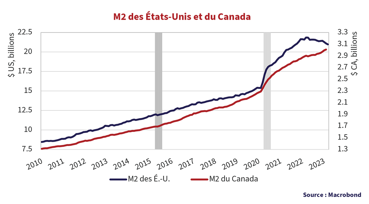 Le graphique ci-dessous de la M2 américaine et canadienne illustre la différence entre les politiques monétaires. La M2 aux États-Unis et au Canada affichait une croissance relativement similaire jusqu’à la pandémie. Maintenant, les États-Unis ont réduit leur masse monétaire après avoir atteint le pic, mais le Canada continue d’augmenter sa M2. La Réserve fédérale américaine et la Banque du Canada ont toutes deux recours à des opérations sur le marché libre pour atteindre leurs taux d’intérêt cibles. Ils retirent de l’argent pour augmenter les taux d’intérêt et fournissent de l’argent pour les réduire. La « pause » des hausses de taux de la Banque du Canada a fait en sorte qu’elle a dû fournir de l’argent pour empêcher une hausse des taux au-delà de sa cible.