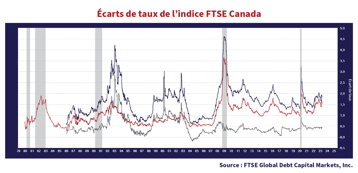 Alors, quand saurons-nous si les banques centrales, et la Banque du Canada en particulier, en auront fait assez? Nous sommes à l’affût de tout éventuel signe de récession, et les écarts de taux sont un indicateur très fiable des difficultés financières des émetteurs. Lorsque les flux de trésorerie internes diminuent, un émetteur doit émettre davantage d’obligations, ce qui entraîne une augmentation de l’offre et de plus grands écarts. Les investisseurs obligataires peuvent même détenir des émetteurs en difficulté au sein de leurs propres portefeuilles. Le graphique ci-dessous illustre les récessions canadiennes dans les zones grisées. La ligne rouge correspond à l’écart entre le rendement de l’indice FTSE Canada Corporate Bond et celui de l’indice Canada Government Bond Index, et la ligne bleue correspond à l’écart entre l’indice BBB et l’indice Canada Government Bond Index. La ligne grise est l’« écart de qualité » entre le rendement d’une obligation notée BBB et celui d’une obligation notée A.