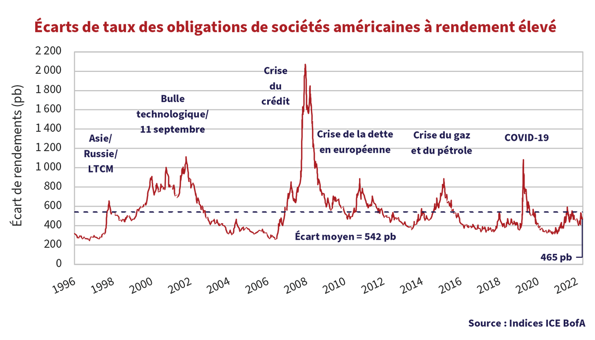 La stabilité de l’écart de qualité entre A et BBB nous porte à croire que la récente crise bancaire a fait grimper tous les écarts des obligations de sociétés, et non seulement ceux des banques. Les investisseurs obligataires n’ont pas encore commencé à s’inquiéter vis-à-vis les obligations de qualité inférieure, comme le laisse penser cet écart. Pour ce qui est du marché américain des obligations à rendement élevé de qualité inférieure, le graphique ci-dessous illustre que les investisseurs ne s’inquiètent pas autrement de la qualité du crédit des sociétés. L’écart de l’indice ICE BofA U.S. High Yield s’établit à 465 points de base, ce qui est supérieur au buffet à volonté pendant la pandémie où la Réserve fédérale achetait des obligations de pacotille sans s’inquiéter outre mesure, mais tout près de l’écart moyen depuis 1996.