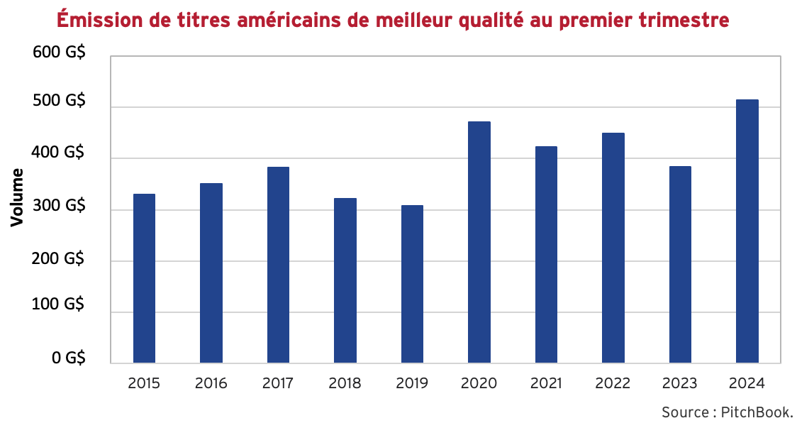 L’optimisme actuel du marché est bien pris en compte dans le volume des émissions sur le marché primaire. Les émissions ont indubitablement repris pour les obligations à rendement élevé de la catégorie spéculative et les prêts à effet de levier, tandis que celles des titres de meilleur qualité ont marqué un record au T1. Des obligations de meilleur qualité d’un montant de 514 G$ US ont été enregistrées au cours du premier trimestre de l’année, ce qui représente une augmentation de 34 % par rapport aux niveaux de 2023. Les nouvelles émissions ont emboîté le pas à une série d’opérations colossales d’AbbVie (notée A-), de Cisco Systems (notée AA-) et de Bristol-Myers Squibb (notée A), qui ont chacune mobilisé plus de 10 G$ US.