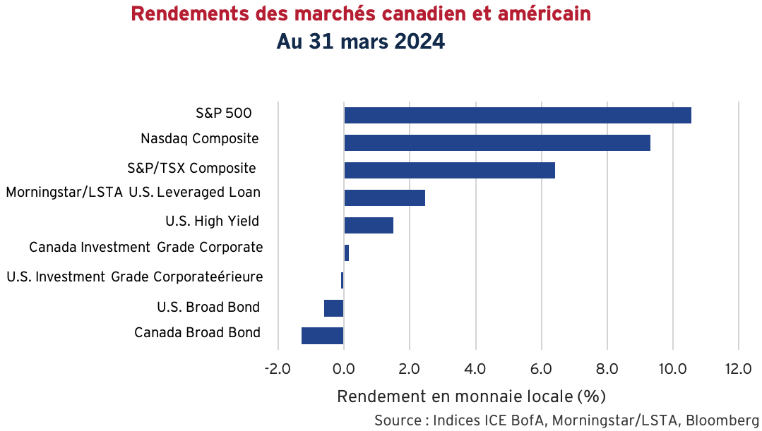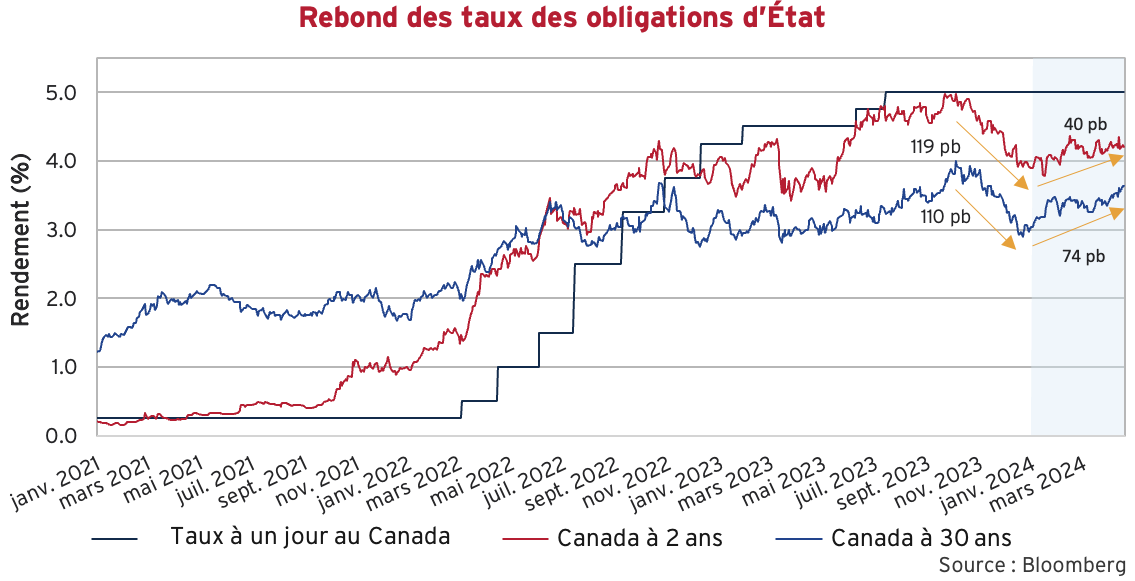 La baisse marquée des taux des obligations d’État à la fin de l’année dernière a entraîné des rendements absolus importants des obligations de grande qualité. Depuis le début de l’année, les taux des obligations d’État ont rebondi plus haut. Le taux des obligations du gouvernement du Canada à deux ans a augmenté de 0,3 % et celui des obligations à 30 ans a augmenté de 0,6 %. Une fois de plus, les intervenants sur le marché obligataire ont rajusté leurs attentes quant au moment où l’intervention des banques centrales surviendra et à l’ampleur de cette intervention. À la fin de l’année dernière, lorsque le taux était à son apogée, les intervenants du marché avaient prévu six réductions de taux au Canada. Cette année toutefois, la tendance s’est inversée et les rendements actuels semblent prévoir seulement 2,5 réductions. Pour la sixième réunion consécutive, la Banque du Canada a annoncé le statu quo de son taux directeur à 5 %. Son attitude continue d’indiquer qu’elle s’apprête de plus en plus à réduire les taux, mais qu’elle doit s’assurer que « le mouvement à la baisse (de l’inflation) est durable ».