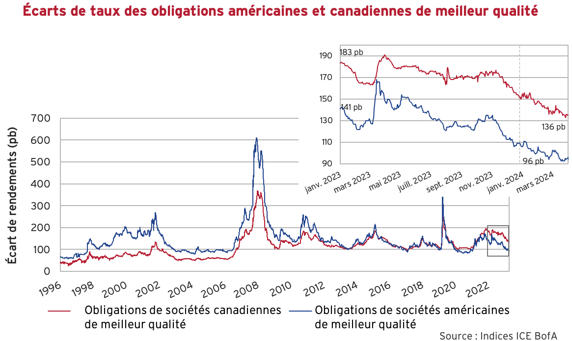 Les écarts de taux des titres de meilleur qualité ont conservé leur élan tout en se resserrant davantage cette année. Voilà un résultat solide au vu de la taille des nouvelles émissions qui ont été absorbées par le marché. Au cours du trimestre, les écarts de taux des titres canadiens se sont resserrés de 15 pb, tandis que ceux des titres américains se sont resserrés de 10 pb. Le marché canadien a été près de résorber l’écart avec le marché américain, mais ses écarts demeurent beaucoup plus grands.