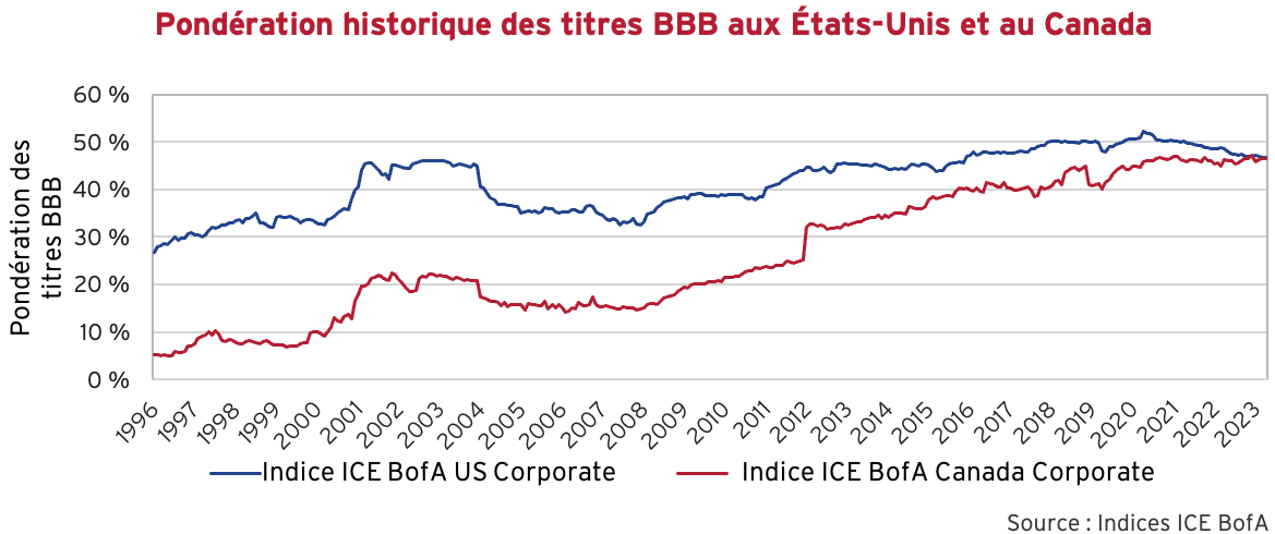Les titres canadiens de meilleur qualité continuent d’offrir une meilleure valeur relative. Malgré ce resserrement, il reste encore du chemin à parcourir pour atteindre les étroites fourchettes de 2021 ainsi que les évaluations d’autres pics du cycle précédent. À la fin du premier trimestre, l’écart de l’indice canadien était de 136 pb, un niveau a priori raisonnable dans le contexte historique. Par le passé, la qualité de crédit du marché canadien a toutefois été beaucoup plus élevée. Le graphique ci-dessous illustre la pondération historique de titres BBB depuis la création des indices canadiens et américains pour les titres de meilleur qualité. Les obligations notées BBB ne représentaient que 10 % du marché des obligations de sociétés canadiennes en 2000, mais l’augmentation constante au Canada a fini par se rapprocher de la situation aux États-Unis ce trimestre, et représente 47 % du marché des obligations de sociétés. Puisque la part de titres BBB est plus élevée, nous devrions nous attendre à ce que le Canada affiche une fourchette plus large que l’étroite fourchette des cycles précédents.