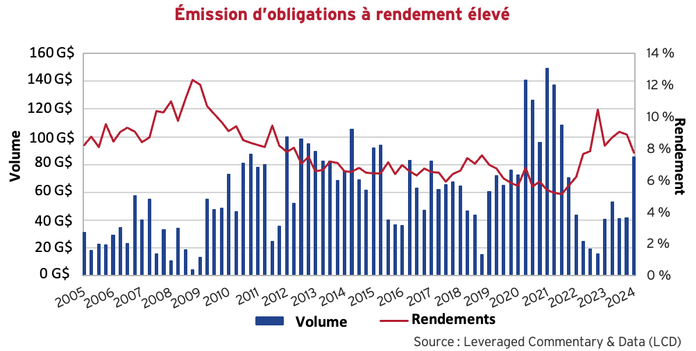 Cette année, nous enregistrons le plus fort volume trimestriel de nouvelles émissions à rendement élevé depuis 2021. À l’époque, les sociétés s’empressaient de fixer les coûts d’emprunt à des niveaux historiquement bas, alors qu’elles le pouvaient. Les rendements plus élevés et des conditions d’emprunt plus rigides paralyseraient les marchés primaires. Puisque les émetteurs disposaient de liquidités abondantes, bon nombre d’entre eux étaient disposés à attendre un jour meilleur. Le rendement moyen des nouvelles émissions est depuis passé de plus de 10 % à la fin de 2022 à un peu moins de 8 % à la fin de mars.