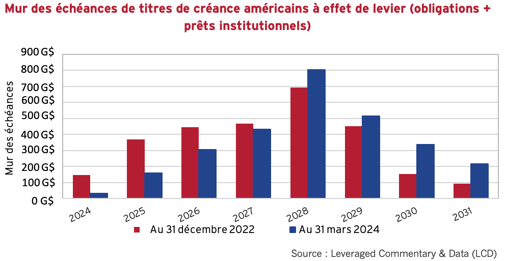 Selon JP Morgan, les activités de refinancement ont progressé au premier trimestre, comptant pour plus de 82 % des émissions à rendement élevé. Voici le moment propice pour les émetteurs qui doivent régler des échéances imminentes au terme de deux années d’émissions modérées. Lorsque les volumes de nouvelles émissions ont chuté de 80 % en 2022, de nombreux investisseurs ont commencé à remettre en question l’imminent « mur des échéances ». Le graphique ci-dessous montre que bon nombre de ces préoccupations ont été dissipées. Au 31 décembre 2022, les obligations à rendement élevé et les prêts à effet de levier d’un montant cumulé de 517 G$ US devaient être refinancés ou remboursés en 2024 et 2025. Revenons-en au 31 mars 2024. Avec le regain d’activité, ce chiffre a diminué pour s’établir à 191 G$ US, ce qui est beaucoup plus gérable.