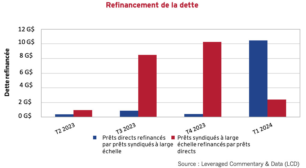 Au cours des dernières années, l’avènement du crédit privé a retenu l’attention du secteur des placements. Le crédit privé peut effectivement avoir des caractéristiques particulières et attrayantes compte tenu de certaines conditions du marché. La conjoncture évolue toutefois au fil du temps. Le crédit privé (aussi appelé le « prêt direct ») fait concurrence aux prêts à effet de levier (aussi appelés « prêts syndiqués à large échelle » [en anglais, Broadly Syndicated Loans]) et aux obligations à rendement élevé. Si le marché des prêts syndiqués à large échelle se replie et que les prêteurs se montrent prudents, les emprunteurs chercheront à bon droit le marché des prêts directs. Lorsque le marché des prêts syndiqués à large échelle reprend de la vigueur, le pendule oscille en sens opposé. Le graphique ci-dessous montre très clairement que le pendule oscille à nouveau en direction des marchés publics au premier trimestre de 2024.