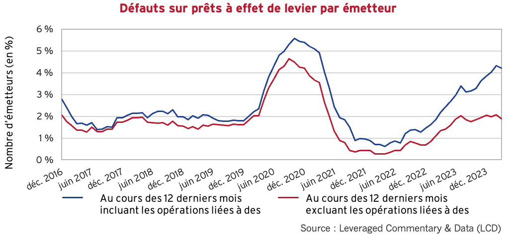 Tout en observant la vigueur des marchés du crédit et le resserrement des écarts de risque, il est intéressant de noter que les défaillances se sont en fait multipliées. PitchBook LCD a publié un nouvel ensemble de données qui intègre à la fois les défauts de paiement et les opérations liées à des titres en difficulté. Le graphique ci-dessous montre que les défauts de paiement ont légèrement augmenté contrairement aux opérations liées à des titres en difficulté qui ont augmenté à un rythme beaucoup plus rapide.