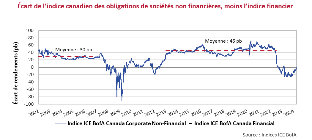 Même si les émissions bancaires d’aujourd’hui consistent en des billets admissibles à la recapitalisation interne au lieu de billets de dépôt comme c’était le cas avant 2018, nous croyons toujours que les sociétés financières doivent revenir à une relation plus normalisée. Ordinairement, les écarts de taux concernant les obligations de sociétés financières sont plus serrés que ceux des autres sociétés, comme le montre le graphique ci-dessous. Depuis la création de l’indice d’obligations des sociétés, le rendement des obligations de sociétés financières a seulement été supérieur à celui de l’indice pendant la crise du crédit, la crise de la dette en Europe, puis de nouveau à compter de 2022. Les écarts de rendement des sociétés financières ont maintenant tendance à revenir à un niveau historique plus normal, soit de 30 à 40 pb plus bas. Ils correspondent maintenant à ceux des sociétés non financières et devraient continuer de baisser.