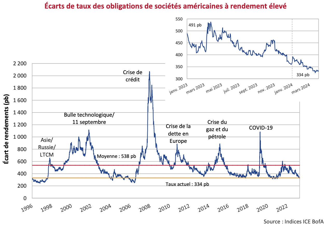 Les titres de créance à rendement élevé ont également maintenu leur vigueur au premier trimestre de 2024. Les écarts de taux ont continué de se resserrer, clôturant le trimestre par un resserrement de 29 pb. Malgré le resserrement des écarts de taux cette année, le rendement du marché des titres à rendement élevé est demeuré stable. La remontée des rendements des obligations d’État a soutenu le rendement des titres à rendement élevé et masqué la rémunération réduite pour le risque de crédit. Nous craignons que les investisseurs investissant dans les titres à rendement élevé n’apprécient pas pleinement la rémunération réduite pour le risque de crédit.