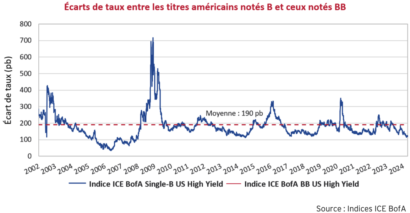 Depuis le début de l’année, les obligations notées B surclassent les obligations notées BB de qualité supérieure. Nous avons tracé ci-dessous la différence d’écarts de taux entre ces deux types d’obligations. Un regain d’appétit pour le risque a réduit la base à 123 pb, ce qui est bien inférieur à la moyenne de la série et, une fois encore, retrace les étroites fourchettes des cycles précédents.