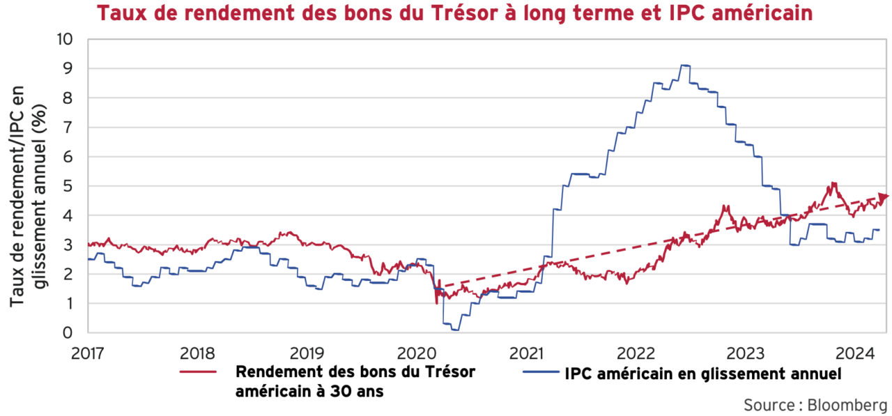 Cet optimisme se justifiait, le premier trimestre 2024 dégageant des progressions de 10 % pour la plupart des principaux indices boursiers. Lorsque l’économie jubile, les obligations fulminent. Leurs taux de rendement ont effectivement augmenté à la suite de bonnes nouvelles économiques et elles ont inscrit des rendements neutres, voire négatifs, les rémunérations qu’elles procurent désormais n’ayant pas compensé la baisse des cours. Selon les prévisions de la majorité sur les marchés, les banques centrales devraient assouplir leurs politiques monétaires et abaisser leurs taux. Cette tendance s’est accentuée à mesure que l’économie semblait de moins en moins morose et que les taux de rendement grimpaient en conséquence.