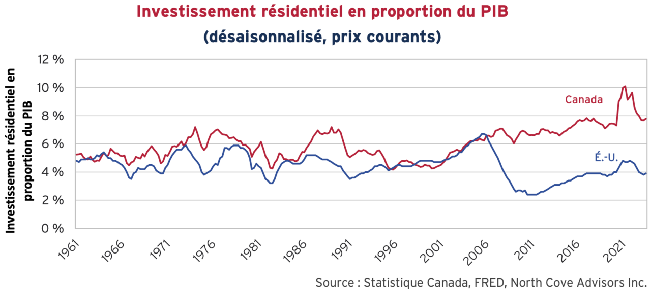 Dès lors, chacun emprunta son propre chemin. Les États-Unis ont resserré les règles sur les prêts hypothécaires résidentiels, mais le Canada a fait le contraire, ouvrant ainsi les vannes du crédit immobilier. Lorsque la bulle immobilière a éclaté aux États-Unis, la part des investissements résidentiels dans le PIB a chuté à un peu plus de 2 %. Au cours de la même période, cette proportion a augmenté à 8 % au Canada (avec même une incursion à 10 % pendant la bulle immobilière de la pandémie), soit le double du 4 % actuel aux États-Unis.