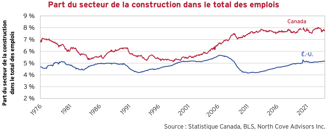 Elles ont alors fait tapis sur le secteur de l’habitation et ont considérablement développé leurs activités de prêts hypothécaires, gracieuseté de l’État. Se félicitant de leurs prouesses financières pour maintenir la solidité du système financier, les organismes de réglementation et les banques du Canada ont, par orgueil, créé une économie plus dépendante du logement résidentiel que jamais. Les États-Unis comptent un peu plus de 5 % de leur main-d’œuvre dans le secteur de la construction, alors que cette proportion s’élève à près de 8 % chez nous, comme le montre le graphique ci-dessous.