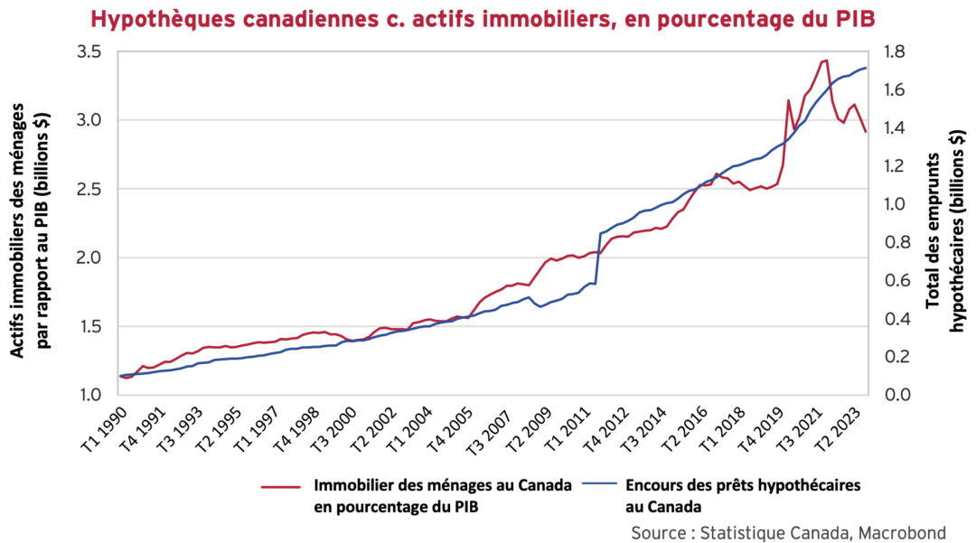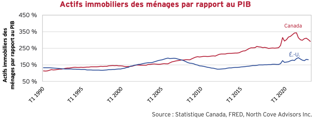 Nous avons tous lu que les ménages canadiens figuraient parmi les plus endettés au monde. Une grande partie de cette dette concerne des hypothèques résidentielles qui financent une grande partie de notre richesse canadienne, immobilisée dans nos maisons, comme le montrent les graphiques ci-dessous. Remarquons que les idées de ces graphiques proviennent de Ben Rabidoux de North Cove Advisors, que nous recommandons fortement pour obtenir l’heure juste sur le marché canadien de l’habitation. Les actifs immobiliers des ménages représentent près de 300 % du PIB canadien, comparativement à moins de 200 % aux États-Unis.