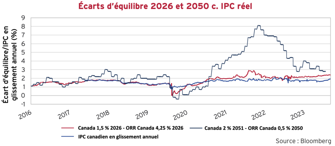 Puisque nous anticipons un plus grand risque de détérioration de l’économie au Canada, nous avons préparé des estimations d’inflation pour les écarts d’équilibre des ORR de 2026 et de 2050, par rapport à l’IPC réel du Canada. Vous remarquerez que l’IPC réel a été supérieur à l’écart d’équilibre de 2017 jusqu’à l’éclosion de la pandémie en 2020, où il a chuté sous le seuil. L’IPC réel a ensuite dépassé les écarts d’équilibre de 2026 et de 2050, en 2021. Il a fallu beaucoup de temps pour que l’inflation réelle atteigne un sommet puis chute, mais l’écart d’équilibre n’a jamais dépassé 3 % et est rapidement revenu à un taux plus modéré de 2 %. Cela témoigne de la confiance des investisseurs obligataires à un retour à la « normale » vers la cible de 2 % de la Banque du Canada.