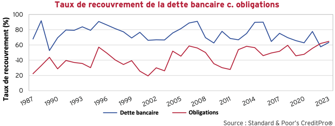 Par exemple, la qualité des émetteurs, les clauses restrictives et les sûretés des emprunts bancaires garantis ont été complètement dénaturées pendant la bacchanale des taux d’intérêt nuls. Historiquement, le recouvrement des emprunts bancaires était bien meilleur que sur les obligations négociables. Comme vous pouvez le voir dans le graphique ci-dessous, ça n’est quasiment plus le cas, car les banques ont assoupli leurs normes pour être compétitives durant cette frénésie de capital à coût nul.