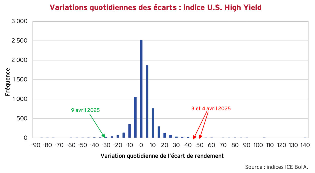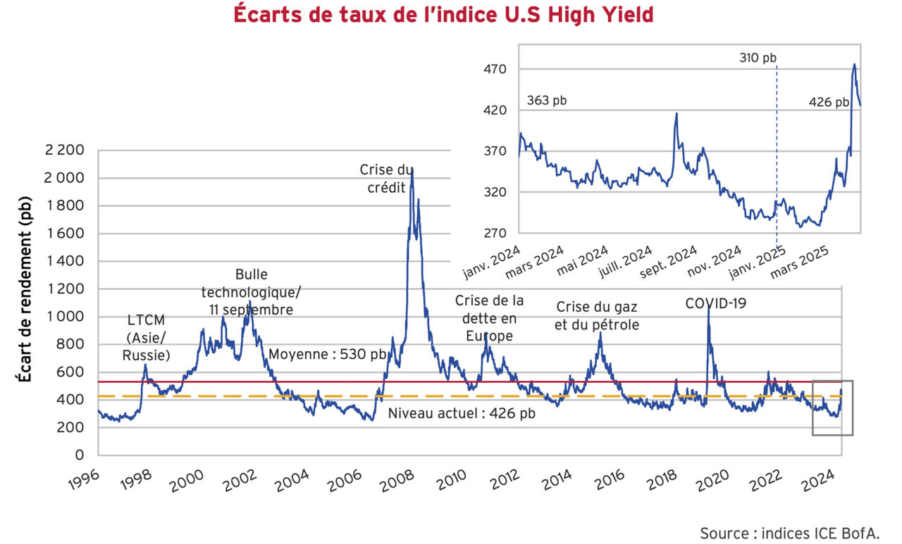 La réévaluation du risque de défaillance a été plus prononcée parmi les émetteurs de titres à rendement élevé, car les investisseurs se méfient de l’incidence des droits de douane sur les emprunteurs de moindre qualité. Le graphique ci-dessous présente les écarts de taux de l’indice U.S. High Yield. Les écarts de taux des obligations à rendement élevé ont augmenté de 65 pb au premier trimestre et, comme nous l’avons souligné plus tôt, ils ont depuis connu des fluctuations quotidiennes historiquement importantes. Les écarts de taux se sont encore élargis de 51 points de base au moment de la rédaction.