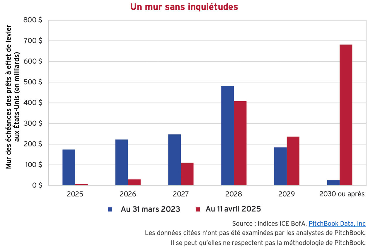 Les investisseurs continuent de réclamer des obligations structurées adossées à des prêts (CLOs), qui permettent de soutenir le pipeline de nouvelles émissions de prêts à effet de levier. Les gestionnaires de CLOs ont pour mandat d’investir les capitaux des investisseurs sur le marché des prêts et s’y adonnent sans remord. Les investisseurs ont injecté 49 milliards de dollars dans les CLOs au premier trimestre de 2025 et près de 200 milliards de dollars dans cette catégorie d’actifs au cours des douze derniers mois. Le marché des prêts à effet de levier regorge toujours de structures d’ententes favorables aux émetteurs, ce qui, selon nous, demeure un risque sous-estimé pour les investisseurs. La faiblesse des structures a entraîné une augmentation des opérations de gestion du passif par les émetteurs, ce qui peut considérablement affaiblir le collatéral qui supporte le recouvrement d’une émission. Nous pensons que cet environnement continue de nécessiter une gestion active et discriminatoire pour évaluer le risque de baisse, mais aussi pour repérer les occasions de valeur réelle au milieu de la volatilité.