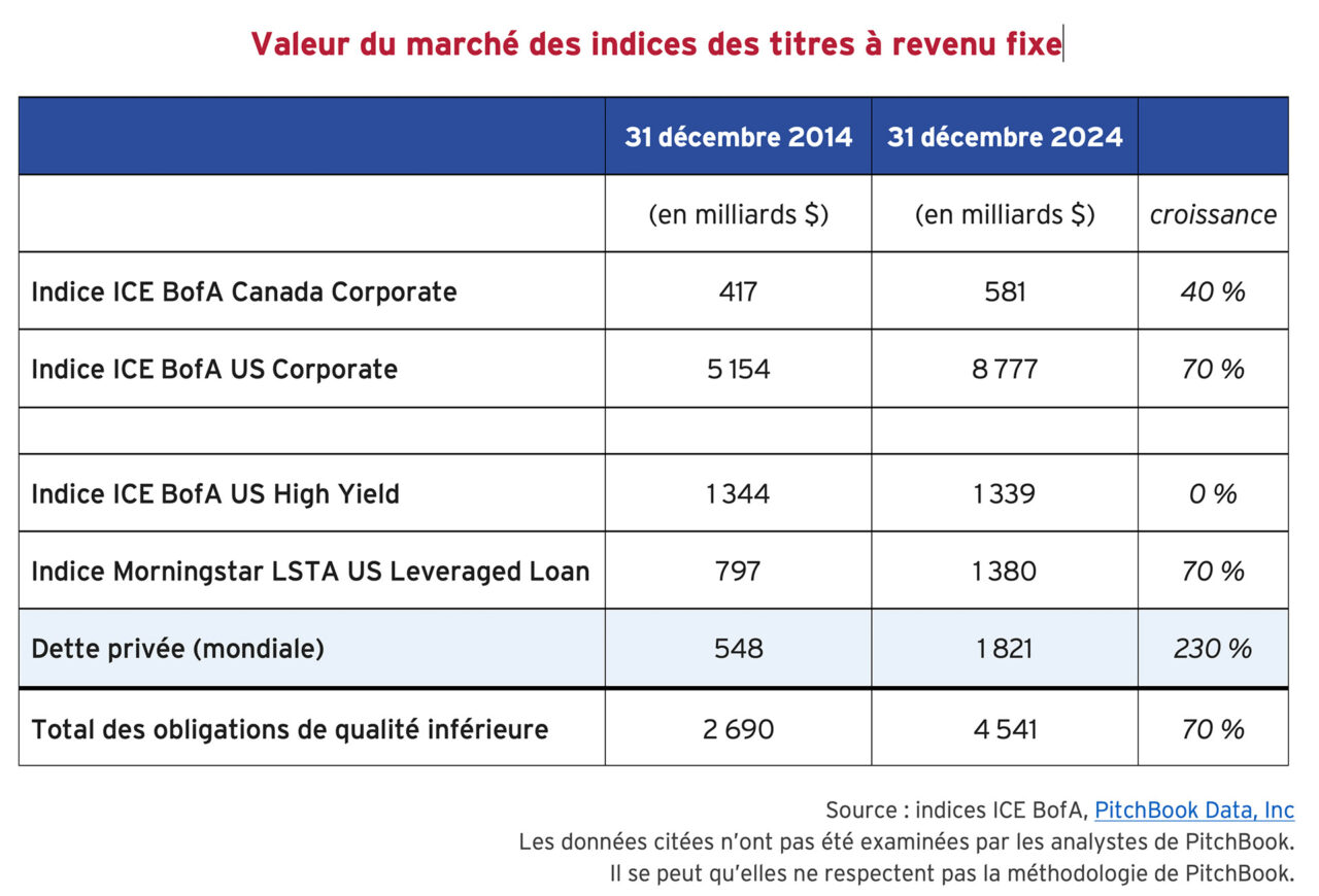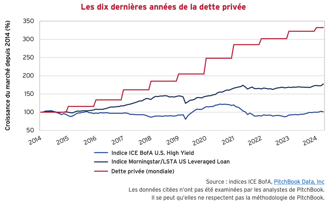 Bien que ces chiffres élevés de croissance ne soient pas très différents, la composition de la croissance au sein des marchés des titres de qualité inférieure saute aux yeux. Il est stupéfiant de voir que l’indice U.S. High Yield Bond a terminé 2014 avec une valeur marchande de 1 340 milliards de dollars et que, dix ans plus tard, il se situe exactement au même niveau. Une croissance nulle sur ce marché au cours des dix dernières années, malgré la croissance de l’économie et l’appétit continu pour l’endettement, est très surprenante. Bien sûr, l’un des faits marquants des dernières années est l’augmentation de la dette privée. Selon PitchBook, qui publie des chiffres annuels, le marché de la dette privée est passé de 548 milliards de dollars à 1 800 milliards de dollars, soit une multiplication par 3,3 sur une période de dix ans.