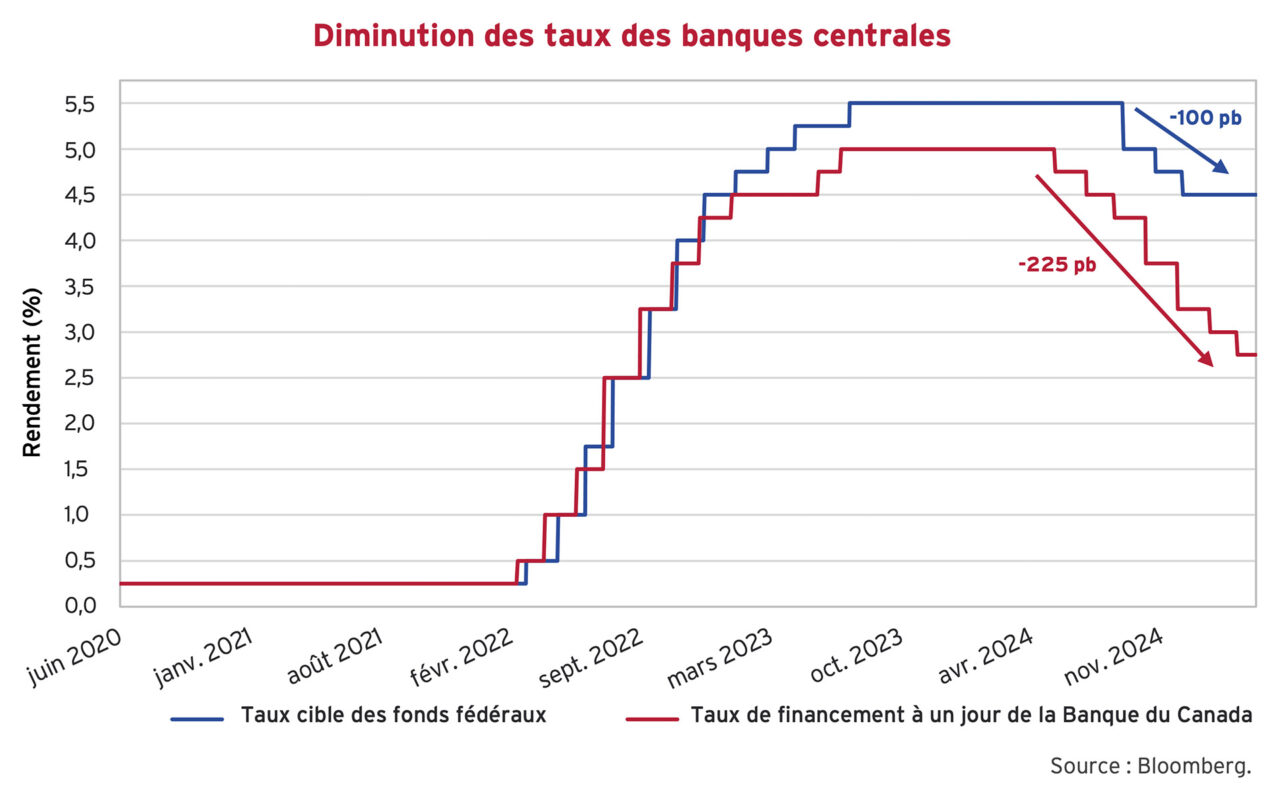 La Banque du Canada (BdC) a poursuivi son effort d’assouplissement en 2025, avec des baisses de taux consécutives de 25 pb en janvier et en mars, amenant le taux directeur à 2,75 %. La BdC a procédé à des réductions durant sept réunions consécutives, avant de passer à une position attentiste en avril, mais elle continuera probablement ses baisses d’ici la fin de l’année. La Réserve fédérale américaine (Fed), quant à elle, a été beaucoup plus mesurée dans ce cycle d’assouplissement, réduisant son taux directeur de 100 pb au total, comparativement aux 225 pb de baisse au Canada au cours de la dernière année. La Banque du Canada, la Fed et leurs homologues à l’échelle mondiale devront relever le défi de déterminer la trajectoire appropriée des taux dans ce qui pourrait évoluer vers un contexte de stagflation.
