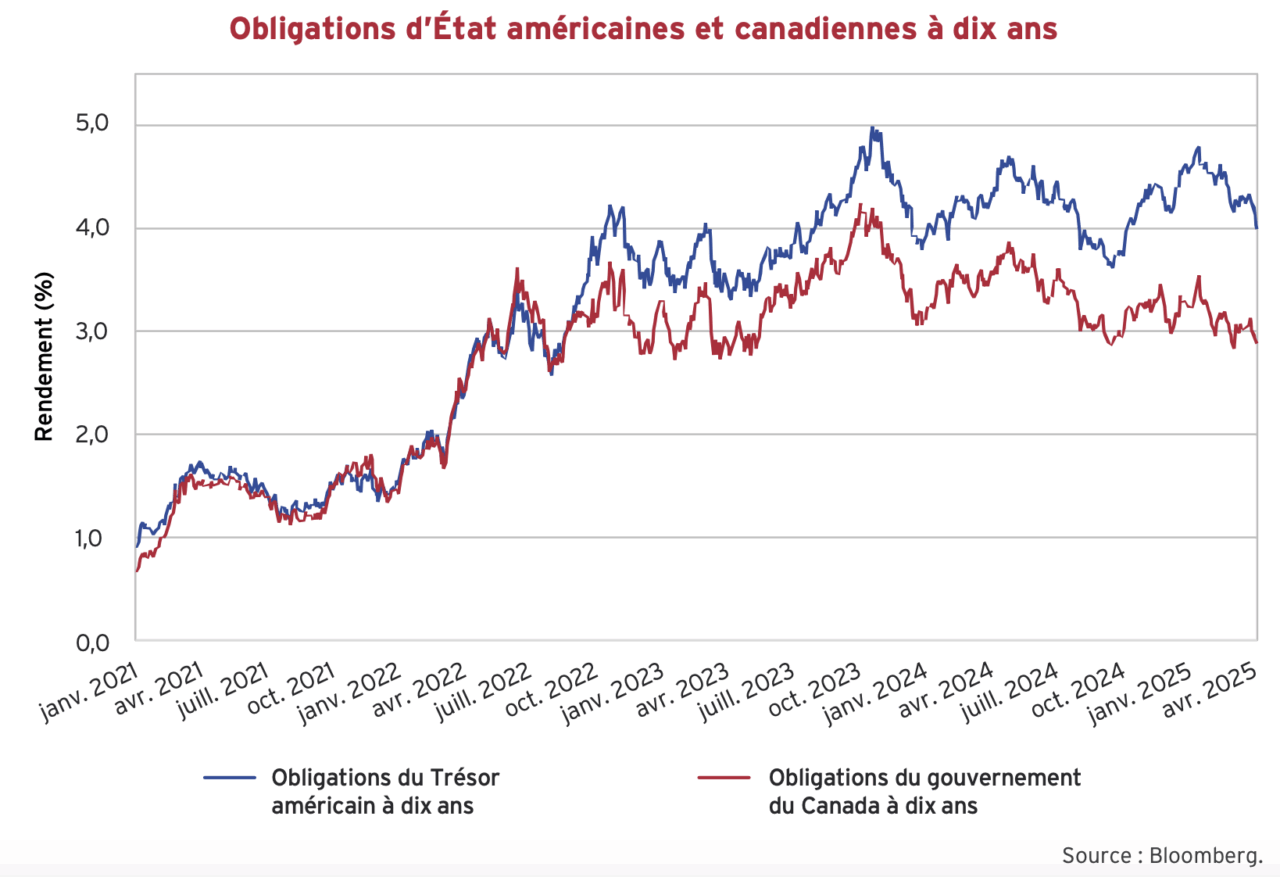 Au cours des deux semaines qui ont suivi la fin du trimestre, les marchés boursiers sont restés en retrait, le temps pour les investisseurs d’assimiler les répercussions probables des droits de douane réciproques, la marge de manœuvre pour des concessions et l’intensification des tensions entre les États-Unis et la Chine. Sur le marché obligataire, les rendements ont changé de cap et sont maintenant nettement plus élevés à la fois au Canada et aux États-Unis. Le graphique des rendements à dix ans au Canada et aux États-Unis ci-dessus illustre cette évolution. Les explications avancées pour justifier le retrait des investisseurs de la « sécurité » des obligations vont des fonds spéculatifs et des grands investisseurs institutionnels qui dénouent encore leurs positions, jusqu’à des théories de transactions malveillantes par des gouvernements étrangers. Peut-être que l’explication la plus simple reflète les perspectives d’une augmentation de l’inflation et des déficits. Quoi qu’il en soit, les marchés à revenu fixe parviennent tout juste à garder la tête hors de l’eau.