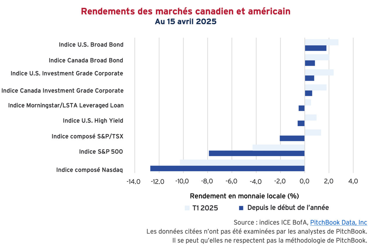 Si les actions de valeur et celles de croissance ont connu une forte baisse, les actions de croissance se sont particulièrement mal comportées, les « sept magnifiques » de la technologie ayant connu le pire trimestre de leur histoire. Tesla a été le plus affecté , avec une baisse de 36 % au premier trimestre, les ventes ayant diminué en raison des protestations contre la participation d’Elon Musk, son directeur général, dans l’administration Trump. Dans la foulée, le Nasdaq a affiché un rendement nettement inférieur à celui du S&P 500, tandis que l’indice composé S&P/TSX du Canada est celui qui a le mieux résisté, grâce à sa pondération accrue dans les secteurs liés aux ressources et à sa pondération plus faible dans le secteur des technologies.