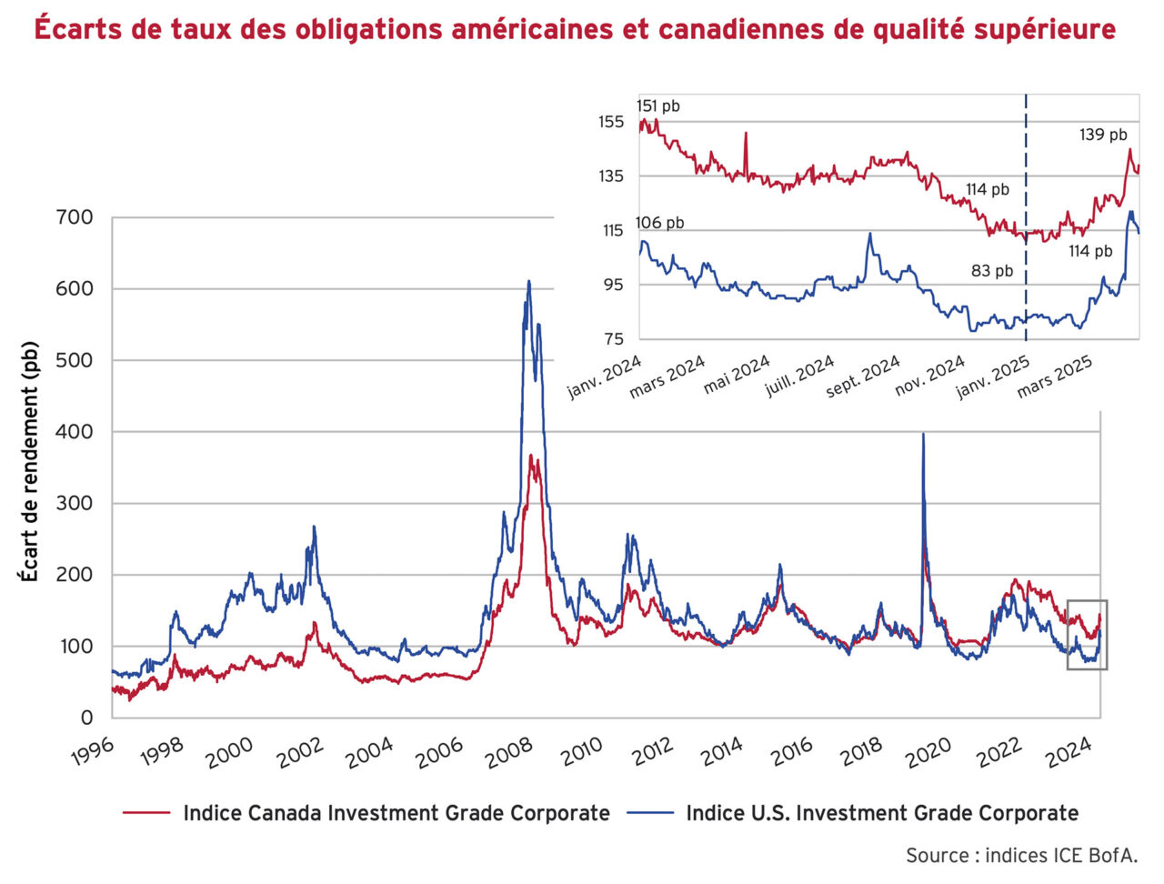 Comme nous l’avions écrit dans notre Infolettre sur les obligations de société de janvier, le caractère relativement agressif des baisses de taux au Canada a contribué à un important creusement des écarts entre les rendements des obligations d’État américaines et ceux de leurs consœurs canadiennes. L’écart entre les deux taux se maintient à des niveaux historiquement élevés. Nous avons tracé ci-dessous le rendement des obligations du gouvernement du Canada à dix ans et celui des bons du Trésor américain à dix ans. Pendant la majeure partie de cette année, les rendements ont chuté, les investisseurs ayant trouvé un certain réconfort dans les obligations d’État en raison de l’incertitude politique. Les obligations américaines à dix ans ont fini par descendre sous les 4 %, avant les répercussions des annonces du « Jour de la libération » le 2 avril. Dans le contrecoup, les investisseurs ont commencé à liquider leurs obligations à long terme du Trésor américain, ce qui a fait grimper les taux.
