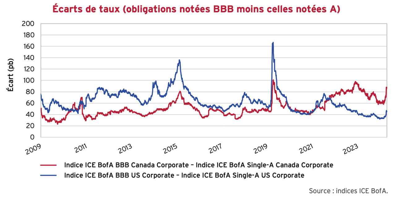 Si l’on examine plus en détail l’indice des obligations de qualité supérieure au Canada et aux États-Unis, on constate que la liquidation des actifs à risque commence seulement à se traduire par des écarts plus importants pour les obligations BBB moins bien notées. Les écarts de taux des titres de qualité supérieure se sont bien comportés par rapport aux autres actifs à risque. Le graphique ci-dessous illustre les écarts de taux entre les obligations notées BBB et celles notées A sur les deux marchés. Aux États-Unis, le taux de référence a légèrement augmenté d’environ 10 pb et n’est pas encore comparable à d’autres périodes de tensions sur les taux. Au Canada par contre, la hausse a été plus décisive, effleurant 30 pb. En ce qui concerne les obligations canadiennes de qualité supérieure, l’inclusion des billets avec remboursement de capital à recours limité (LRCN) a eu un impact significatif sur ce creusement. Sans l’incidence des LRCN, l’écart canadien serait beaucoup plus conforme à celui du marché américain.