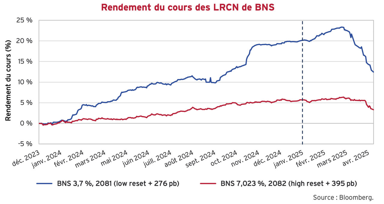 Depuis qu’ils ont été émis, nous avons observé des cours de titres « high reset » de 400 pb et plus et des cours « low reset » de 300 pb et moins. La difficulté des « low reset » LRCN tient au fait qu’à mesure que les écarts de taux augmentent, la probabilité que ces titres soient rachetés à leur première date de révision diminue. Par conséquent, ils peuvent être négociés comme des obligations à plus long terme, avec une volatilité des cours beaucoup plus importante. À mesure que les écarts de taux se sont resserrés en 2024, la probabilité que ces « low reset » LRCN soient rachetés a augmenté, ce qui a fait remonter leurs cours. L’inverse s’est produit jusqu’à présent en 2025.