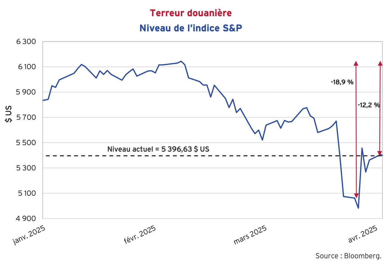 Les marchés boursiers se sont effondrés le 3 avril, après l’entrée en vigueur des droits de douane imposés à l’occasion du Jour de la libération. Les droits de douane ont été beaucoup plus élevés que prévu et le S&P a clôturé à 4 983 le 8 avril, soit une baisse de près de 20 % par rapport au sommet de 6 144 atteint le 19 février après l’investiture du président Trump.