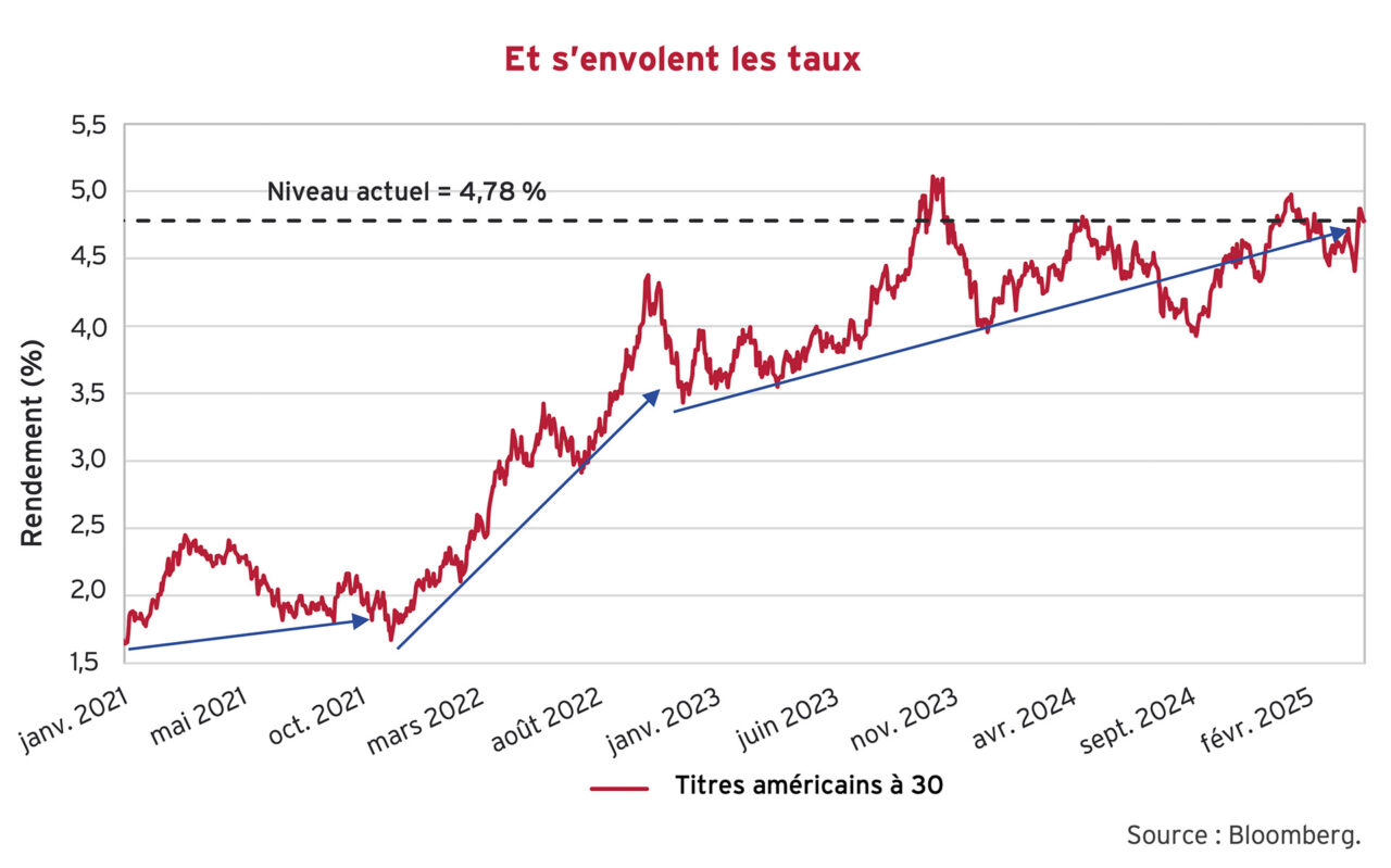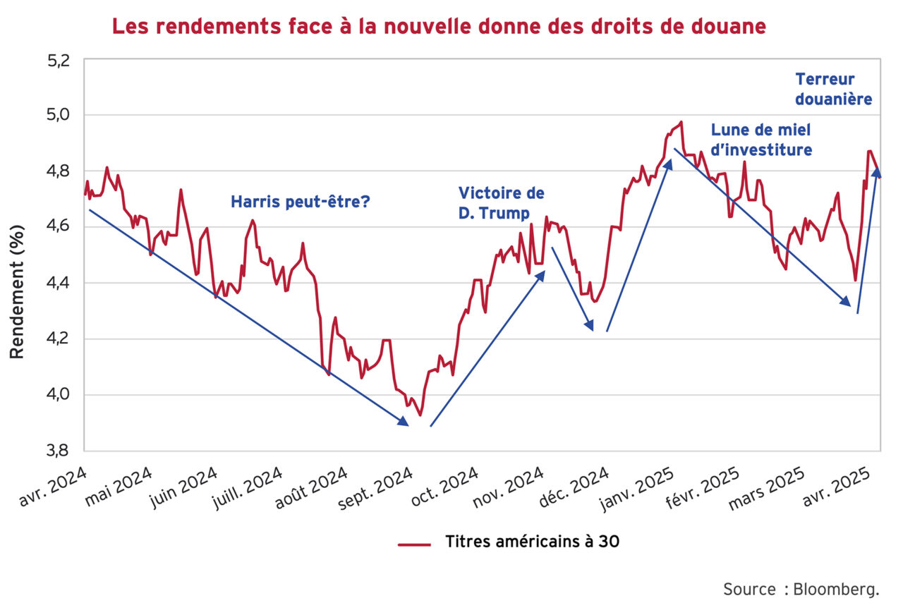 En effet… La guerre commerciale de M. Trump fait grimper les attentes inflationnistes et réduit la confiance dans l’exceptionnalisme américain et peut-être également la demande d’actifs financiers américains. Le marché réagit cependant aux déficits budgétaires américains depuis un bon moment, qu’ils soient ceux de M. Biden ou de M. Trump. Comme nous l’avons déjà dit, depuis les creux à près de 1 % lors de la pandémie, le rendement des obligations du Trésor à long terme a évolué par étapes, pour atteindre 3 % et a augmenté régulièrement pour dépasser 4 % depuis 2023. Le récent bond est attribuable à tous les droits de douane de M. Trump, mais la persistance des déficits massifs du gouvernement fédéral américain augmente l’offre de bons du Trésor. L’extension des réductions d’impôt du président Trump ne devrait pas s’accompagner d’une augmentation des autres recettes ou de réductions importantes, malgré les bonnes intentions d’Elon Musk et du département de l’Efficacité gouvernementale (DOGE), de sorte qu’il y aura probablement des dépenses déficitaires et des émissions de titres du Trésor importantes pour de nombreuses années à venir.