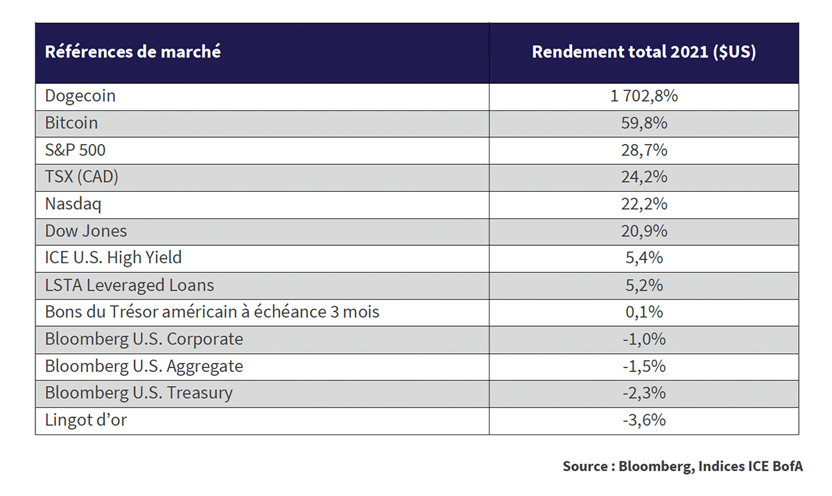 En 2021, les marchés financiers ont continué de se réjouir de l’abondance, voire de la surabondance, d’argent. Comme le montre le tableau ci-dessous, l’argent traditionnel produit par les banques centrales s’est avéré populaire auprès des investisseurs, même chose pour les monnaies numériques. Cette popularité a fini par propulser les marchés financiers vers une nouvelle année de résultats très solides. Le marché boursier a connu ce qui aurait pu être considéré par le passé comme une année exceptionnelle, mais la véritable explosion des cours est venue des monnaies numériques, avec une hausse de 1 702,8 % pour le Dogecoin, monnaie préférée des adeptes du numérique. Celle-ci est suivie par le Bitcoin avec un rendement de 59,8 %.