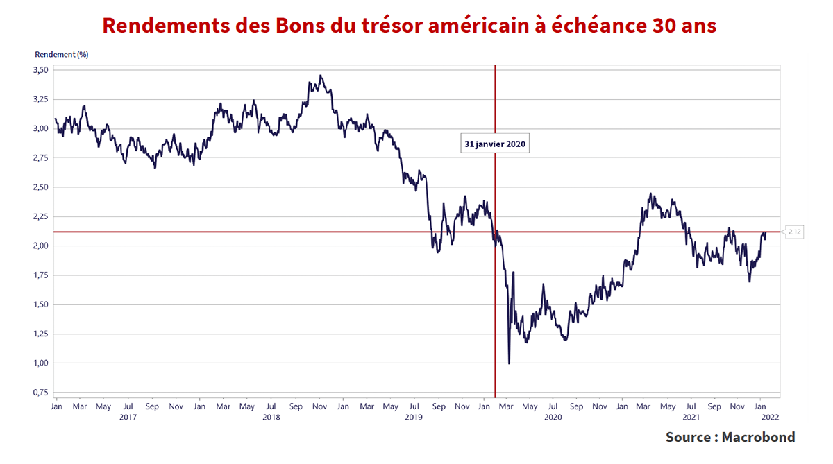 Les choses ne s’annoncent pas au mieux pour les investisseurs obligataires en ce début d’année 2022. En effet, la baisse des taux et la hausse des prix des obligations se sont brutalement inversées. Les rendements des obligations du Trésor à long terme sont passés de 1,68 % le 3 décembre à 2,11 % aujourd’hui, soit une hausse de 0,43 %. Le rendement de -1,3 % de l’indice Bloomberg U.S. Aggregate Bond depuis le début de l’année 2022 représente déjà plus de 80 % de sa perte totale de 2021, avec -1,5 %. Comme le montre le graphique ci-dessus, le taux de 2,12 % à la clôture le 14 janvier 2022 est désormais supérieur aux 1,99 % de la fin janvier 2020, juste avant le début de la pandémie de COVID.